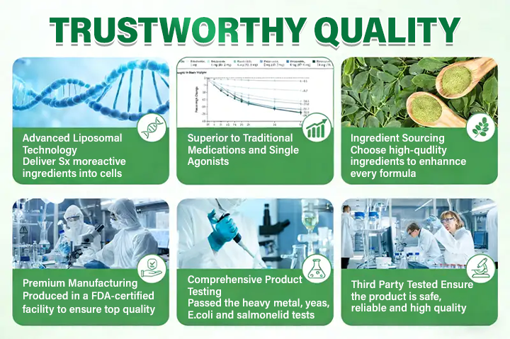 With aging, stress, and a fast-paced lifestyle, many people experience mood swings, anxiety, insomnia, memory decline, and brain fog from blood sugar fluctuations, inflammation, low energy, and nervous system overload. For women, menopause can further intensify hot flashes, mood instability, and poor sleep. To address this, key ingredients work together: Ashwagandha lowers stress hormones and improves sleep; Magnesium calms the nervous system; Omega-3 and Ginkgo Biloba protect neurons and boost focus; NAD+/NMN restore brain energy. Clinical data show that in 2–4 weeks, over 85% improved mood and sleep; in 4–6 weeks, about 80% saw better memory and less brain fog; and over 79% of women reported menopause symptom relief. Overall, this combination stabilizes mood, restores brainpower, and keeps the mind clear and focused.